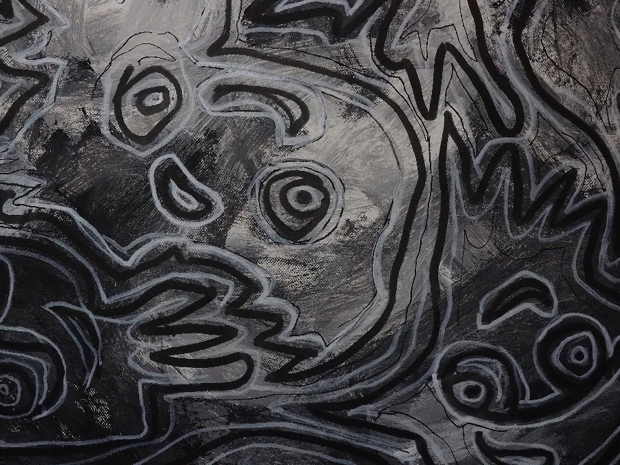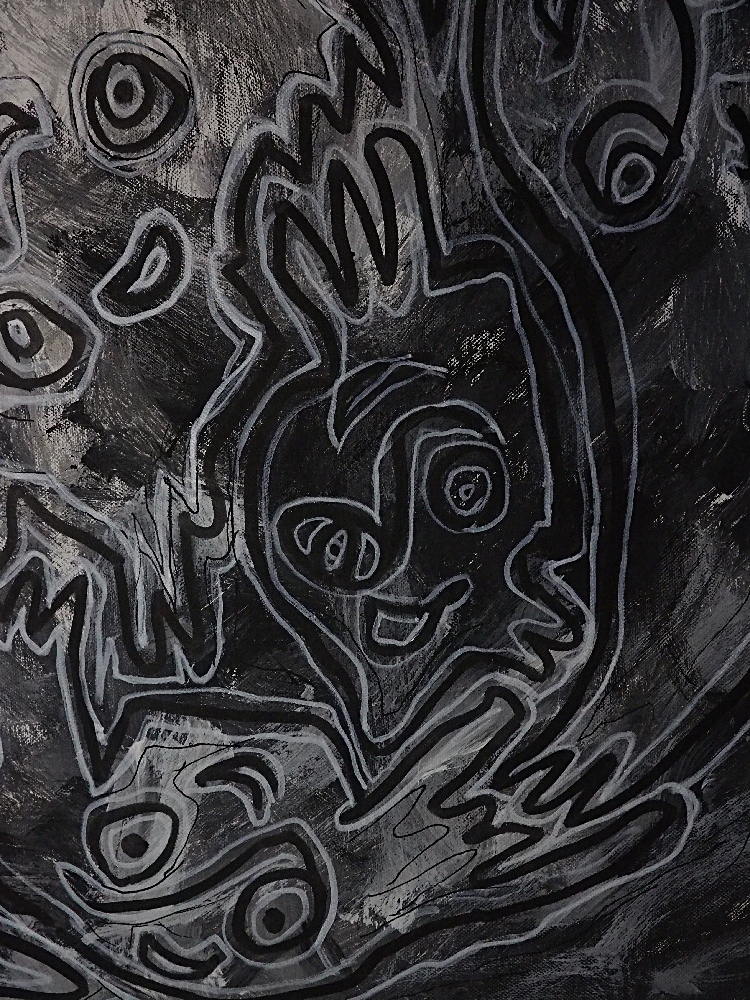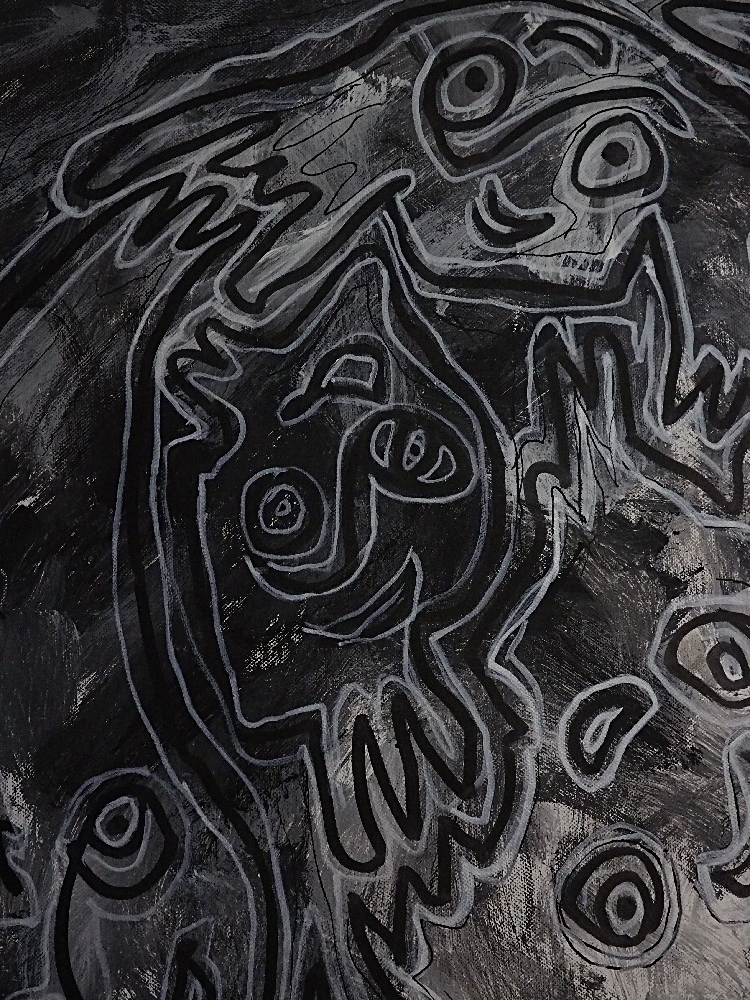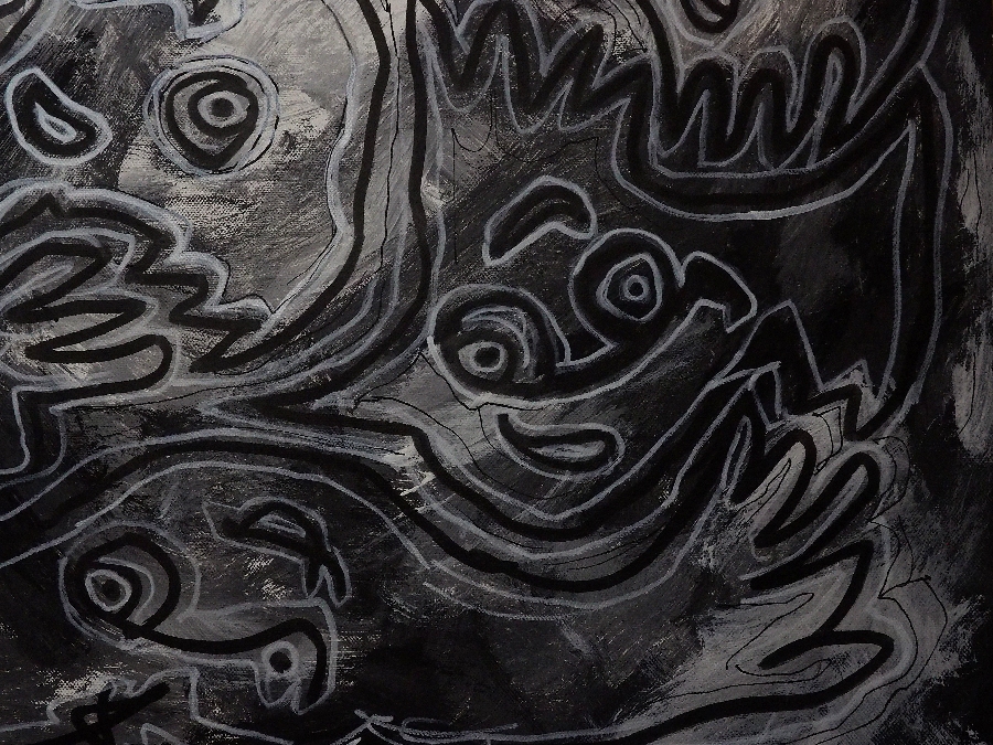 Betrachtet man die oben im Bildausschnitt gezeigte umkehrbare Figur, so muss ich mir eingestehen, dass ich nicht wüsste, wie ich diese Formen in andere Farben umsetzen könnte. Die Figuration entsteht aus dem Hell-Dunkel-Kontrast, so dass ich auch bei Farben wie Rot oder Blau mit Hell-Dunkel-Kontrasten arbeiten würde, um zu Figurationen zu gelangen. Schließlich gibt es keine Vorzeichnung, sondern das Gemälde entsteht im Prozess des Auftragens von Acrylfarben auf die Leinwand. Durch die Pinselspuren gelange ich dann zu Figurationen, die ich weiter mit dem Tuschestift präzisiere.