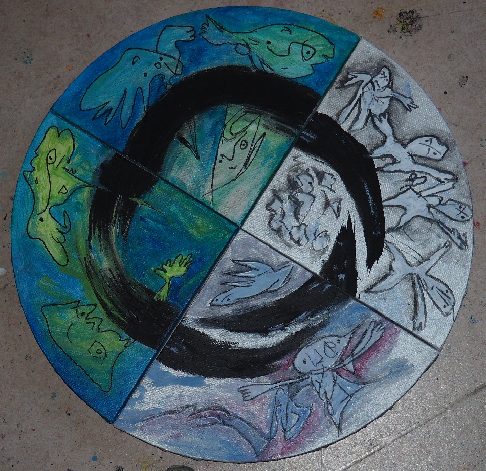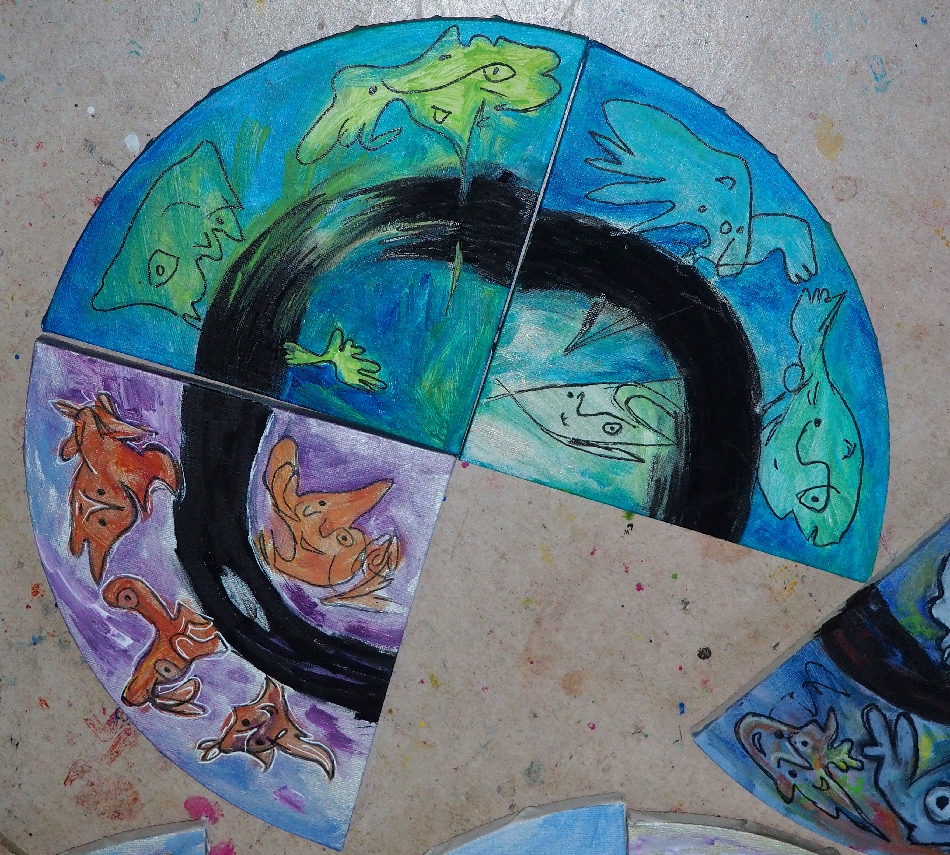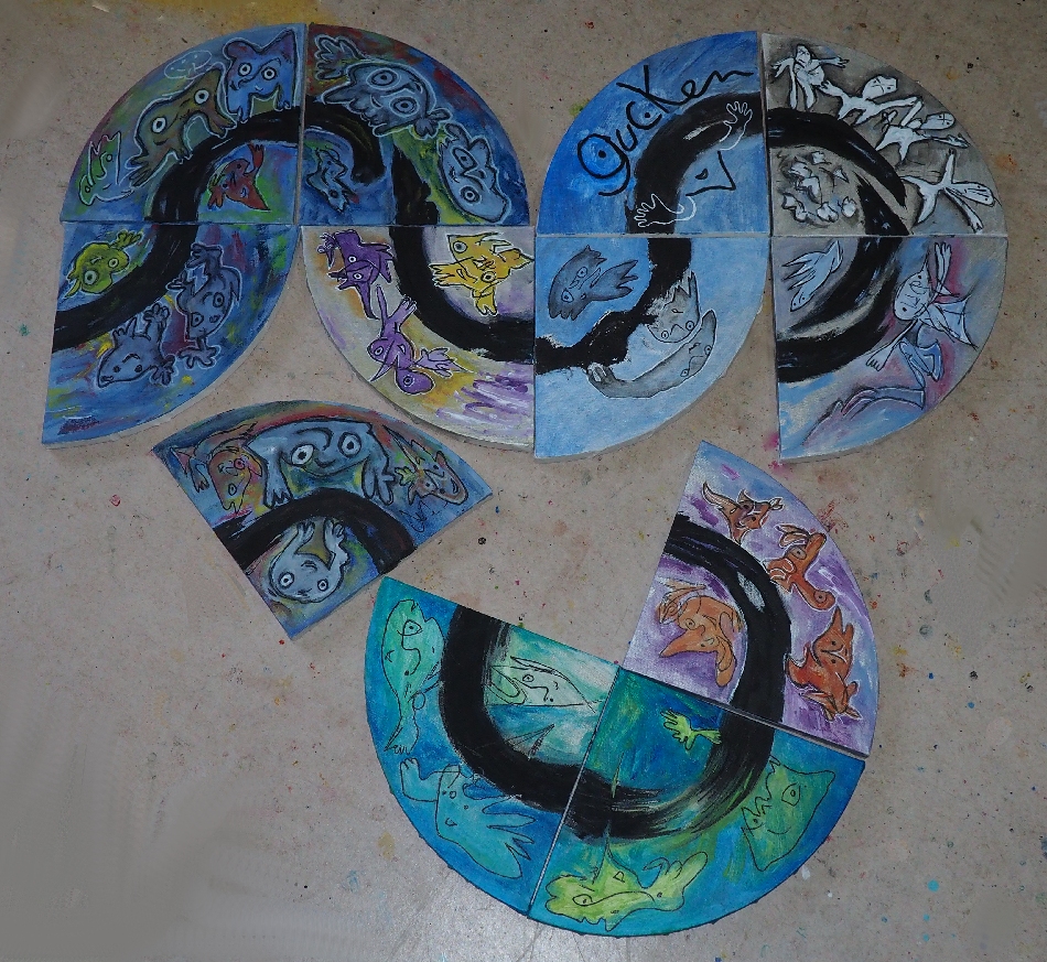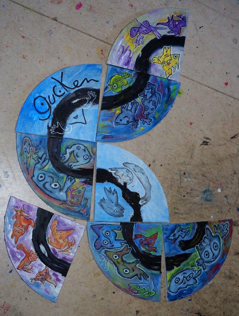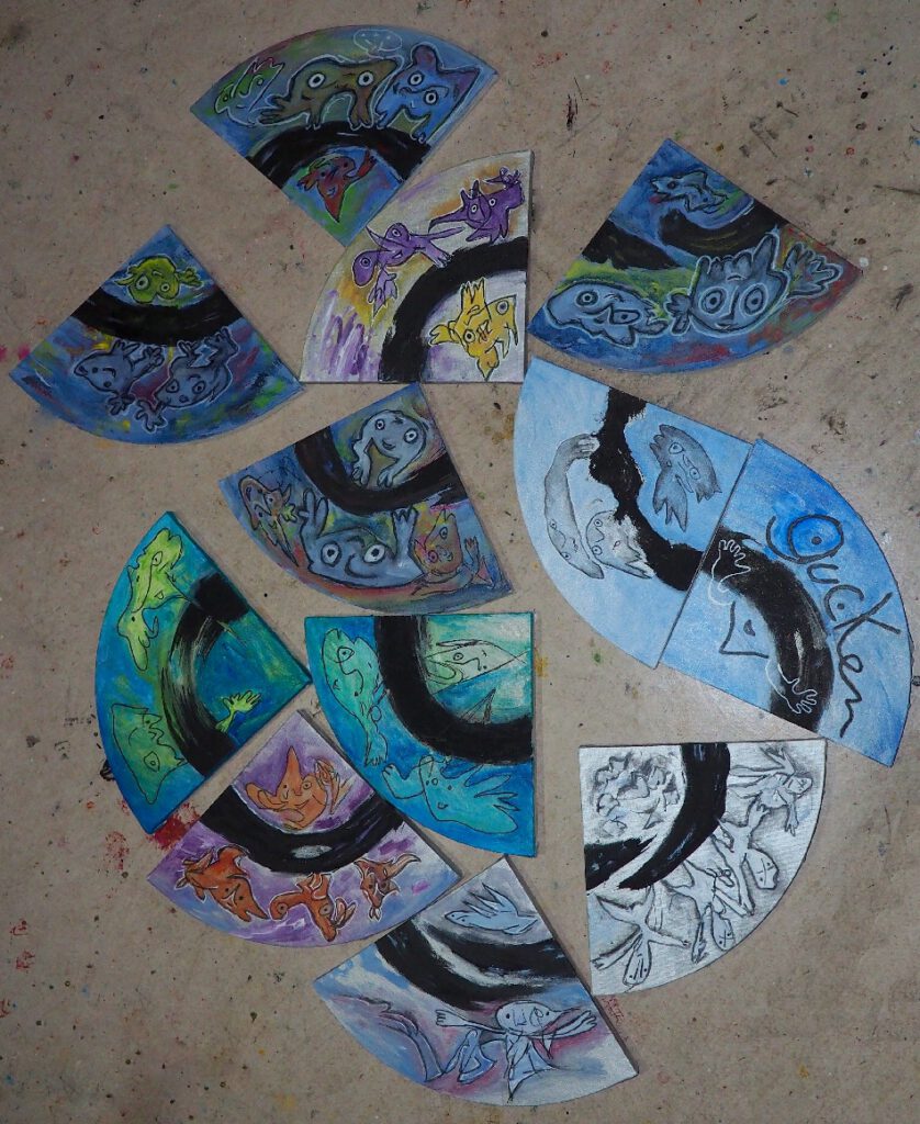 Das zusammenlegbare Puzzle-Gemälde „Eine eckige Runde drehen“ aus dem Jahr 2024 habe ich weiter fortgesetzt. Es geht um das „gucken“ oder eben das Anschauen und immer wieder neu zusammenlegen.