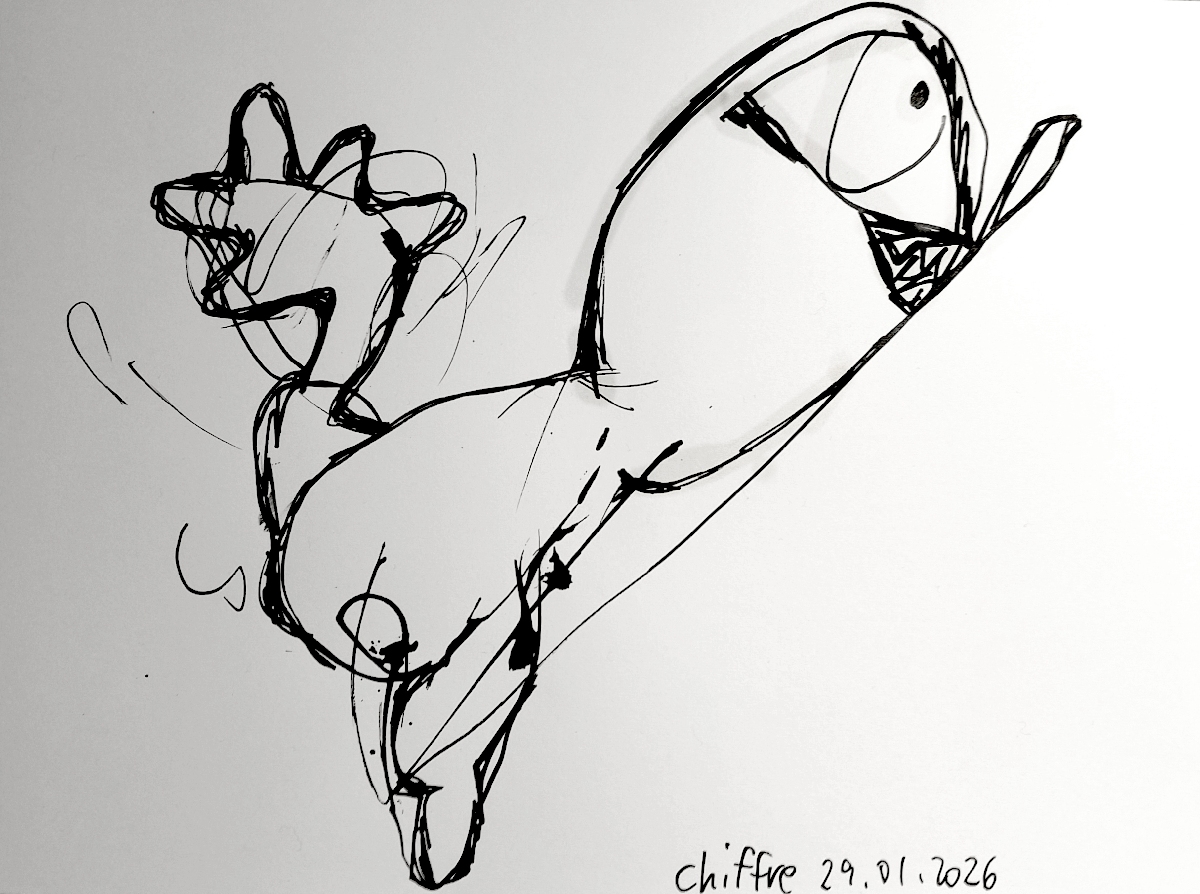 Diese Zeichnung gefällt mir besonders, die Figuration sieht nach „Abflug“ aus. Das gefällt mir.