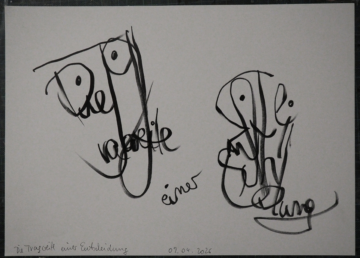 Ist es Zufall, dass ich an japanische Schriftzeichen denken muss. Aus „Die Tragweite einer Entscheidung“ möchte ich ein farbig gefasstes Gemälde machen, doch die Komposition ist im ersten Entwurf noch nicht zufriedenstellend. Es ist eine Vorzeichnung oder Unterzeichnung auf der Folie über Cardboard im Format 40 cm x 50 cm aus dem April 2026.
