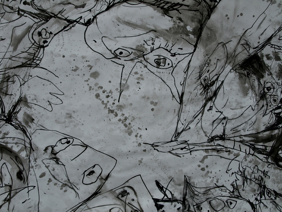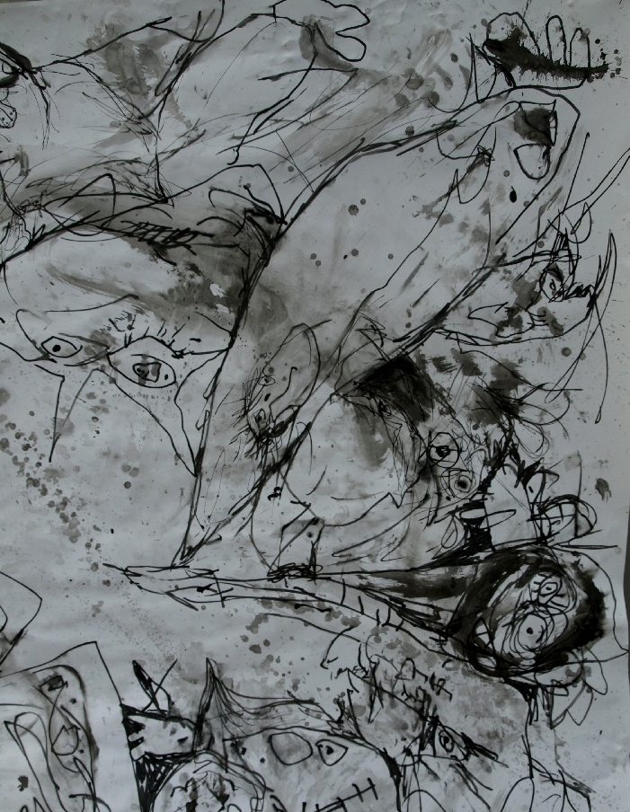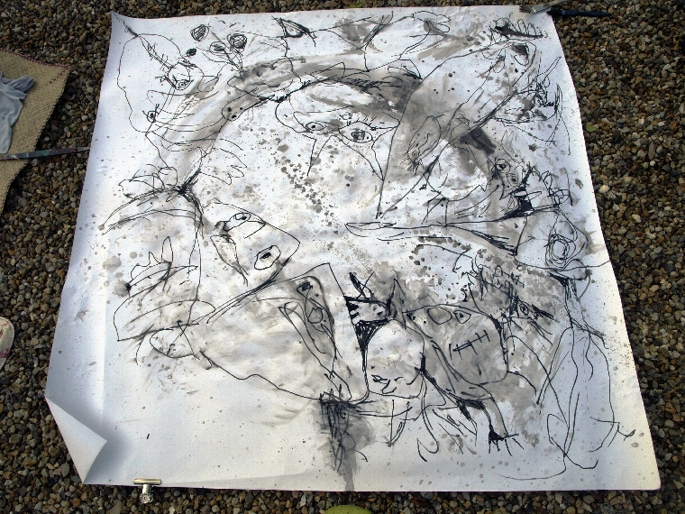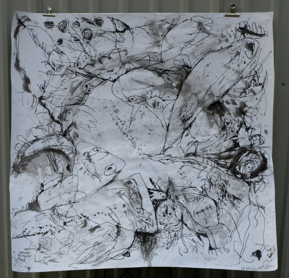 Den Anfang haben Tuscheflecken gemacht, dann eine große Kreisbewegung, auf dieser Kreisspur habe ich rundherum Figuren improvisiert. 120 cm x 120 cm ist diese Tuschmalerei .