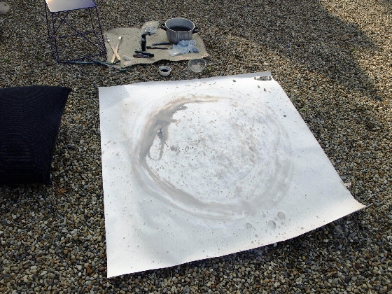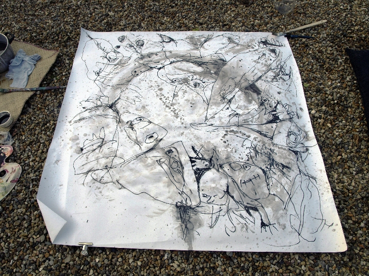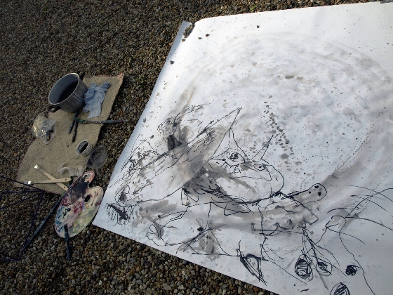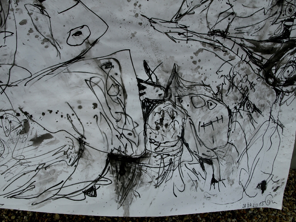 2015 habe ich einen großen Malkarton auf dem Kies ausgebreitet und auf dem Boden mit Tuschestiften, Pinsel, Lappen, wasservermalbarem Graphit gemalt.
