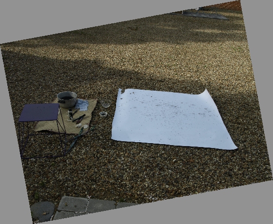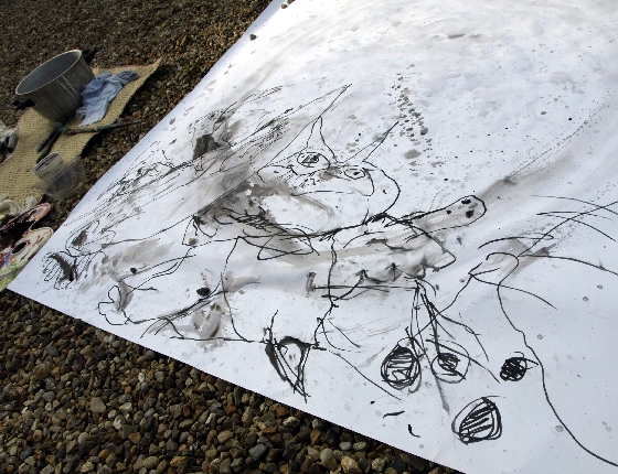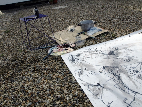 I 2015 bredte jeg et stort stykke pap ud på gruset og malede på jorden med blækpenne, en pensel, en klud og vandopløselig grafit.