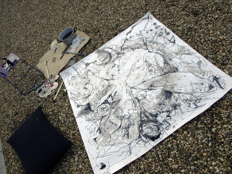 Jeg startede med blækpletter, derefter en stor cirkulær bevægelse, og jeg improviserede figurer omkring denne cirkulære sti. Dette blækmaleri måler 120 cm x 120 cm.