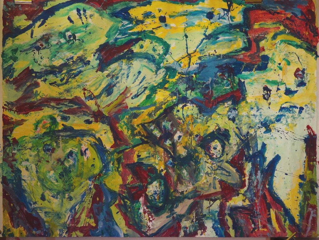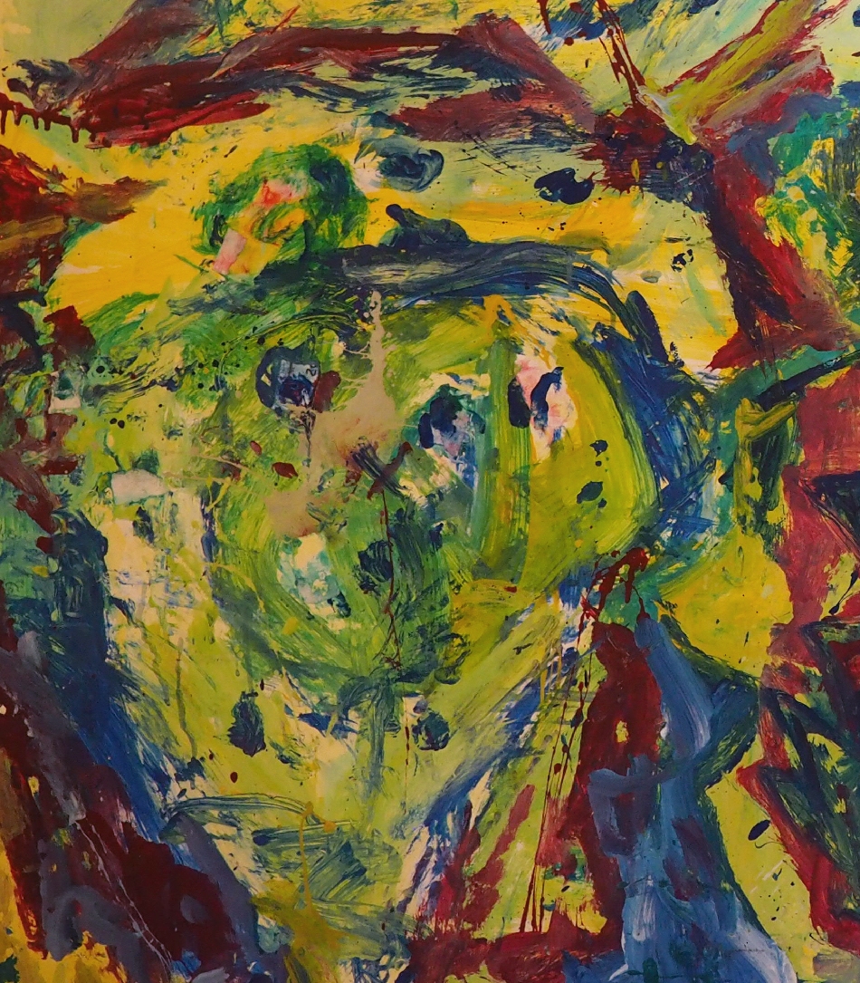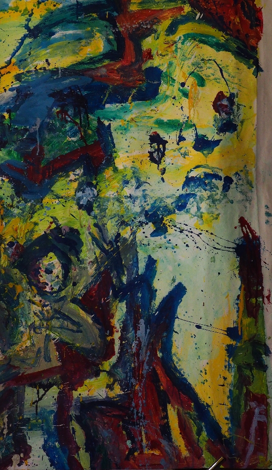 Die Acrylfarbe habe ich mit breitem Pinsel und mit den Händen aufgetragen, aus dem Schwung entstandene Flecken werden kontrolliert einbezogen und nicht zugemalt. Die Farbspritzer bleiben, diese sind bewusst als Flecken für figurative Fantasien, Auge, Mund, Maske und Grimasse eingesetzt.